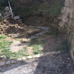 Zunächst haben wir eine Drainageschicht und ein Leerrohr für ein Stromkabel verlegt.Nachdem alle Materialien oben waren, konnte mit Muße und Kraft die Mauer zur Standsicherung des Hangs aufgebaut werden.